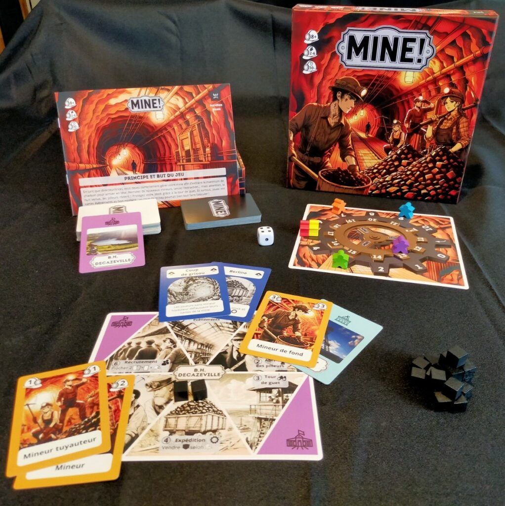 Le jeu de société Mine!, où chaque joueur incarne un directeur de mine de charbon. Il doit positionner ses mineurs aux bons endroits et aux bons moments pour extraire du charbon, recruter d’autres mineurs, protéger son stock et regarder chez les concurrents s’il n’y a pas du charbon à leur subtiliser. Enfin des cartes évènements doivent être posées au bon moment, attention donc au coup de grisou, car il pourrait freiner votre avancée.